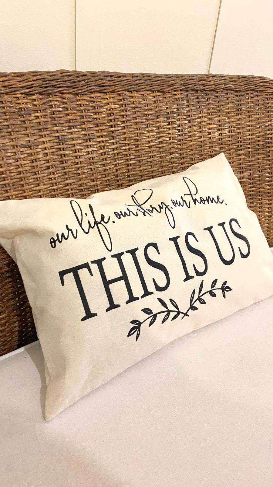 Nossas almofadas “This is us”, no modelo baguete, são feitas com capas de algodão cru, destacando a frase significativa “This is us”. Perfeitas para adicionar um toque pessoal e acolhedor à sua decoração Farmhouse.