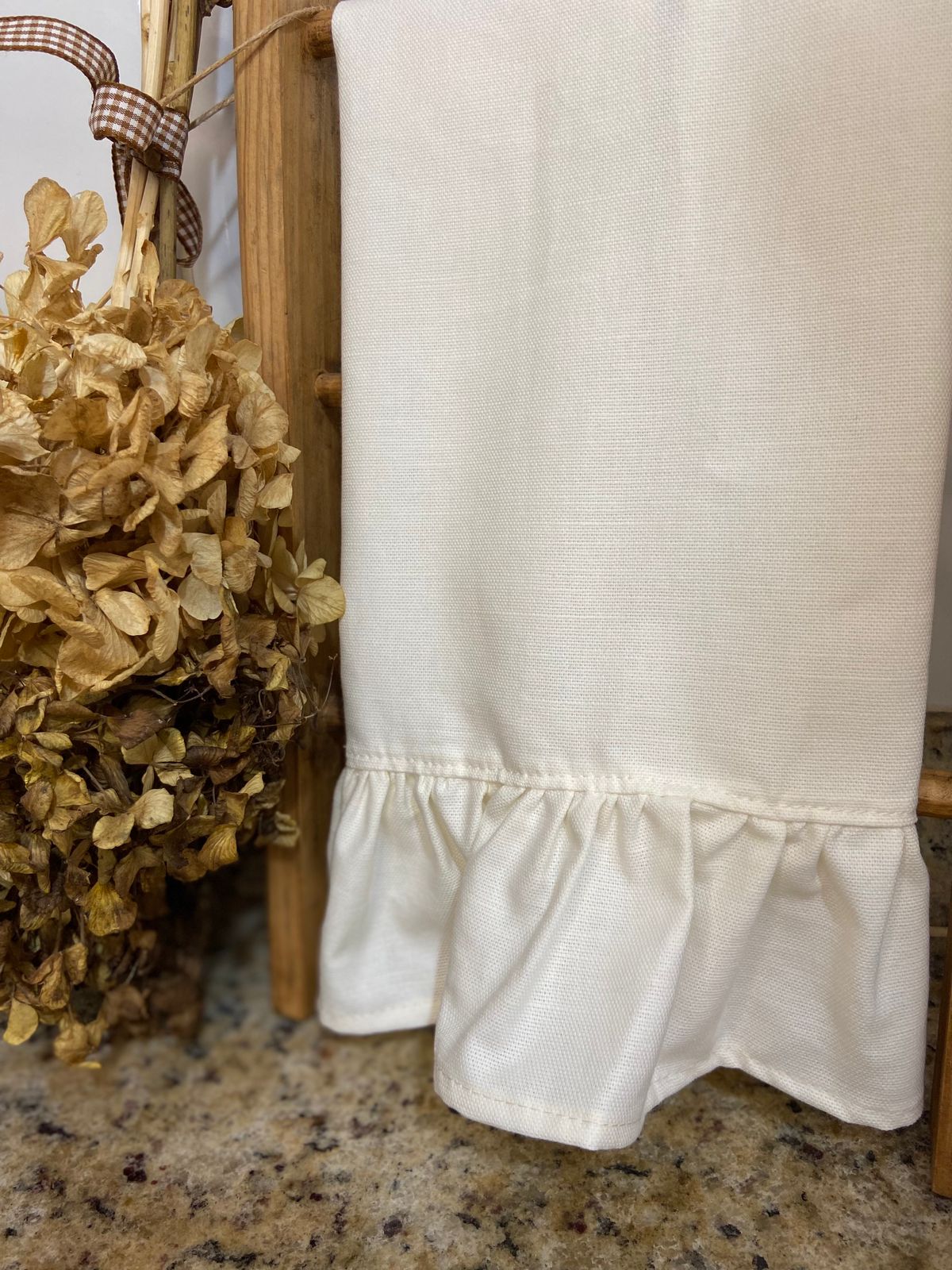 Esta encantadora toalha de mão em linho é perfeita para adicionar um toque de charme rústico à sua casa. Feita com linho misto de alta qualidade e uma barra de babado característica do estilo Farmhouse, esta toalha é tanto prática quanto elegante. Com tamanho de 40x60 cm, é ideal para uso no lavabo ou na cozinha, oferecendo detalhes onde você precisa. Adicione um toque de charme campestre à sua rotina diária com esta linda toalha de mão!